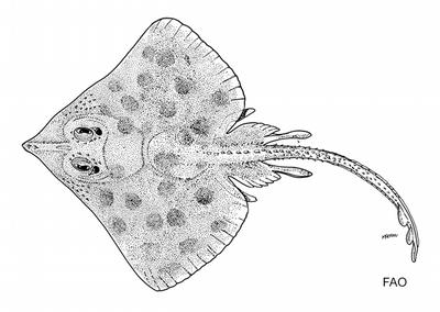 Upper surface of disc is largely smooth except around the eyes. Pale coffee brown except for a translucent area either side of rostral cartilage. Pale areas around the mouth, gill openings and tail (Ref. 6902).